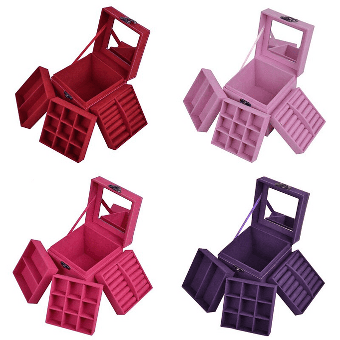 Three Layer Velvet Jewelry Box with Mirror and Decorative Handle